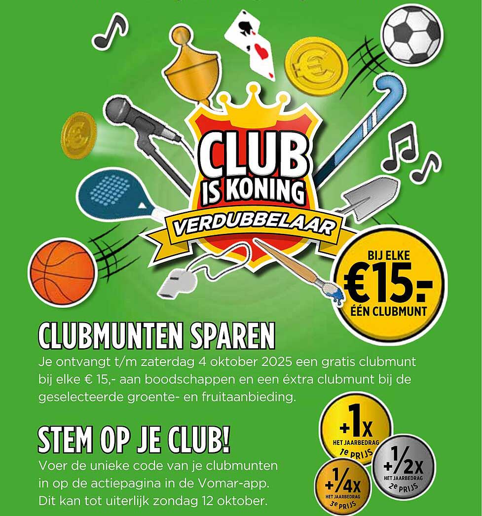 Bij Vomar is het sparen van clubmunten nog nooit zo eenvoudig en aantrekkelijk geweest! Tijdens deze actieperiode, die loopt tot en met 4 oktober 2025, ontvang je bij elke € 15,- aan boodschappen een gratis clubmunt. Dit is een unieke kans om extra te profiteren van je aankopen.