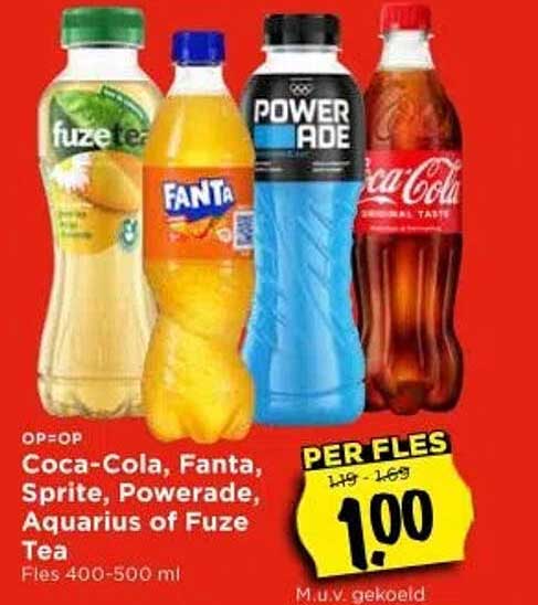 Bekijk nu de Coca-Cola, Fanta, Sprite, Powerade, Aquarius of Fuze Tea Fles 400-500 ml aanbieding in de Vomar folder. Deze aanbieding is geldig van 25-09-2025 tot en met 27-09-2025.