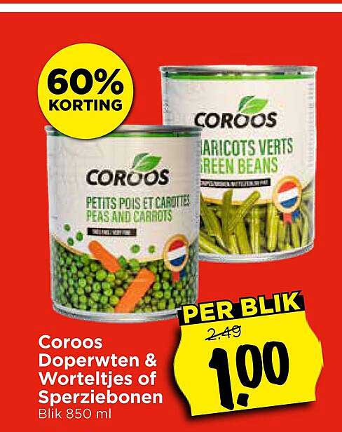 Bekijk nu de Coroo Doperwten & Worteltjes of Sperziebonen Blik 850 ml aanbieding in de Vomar folder. Deze aanbieding is geldig van 30-07-2025 tot en met 02-08-2025.