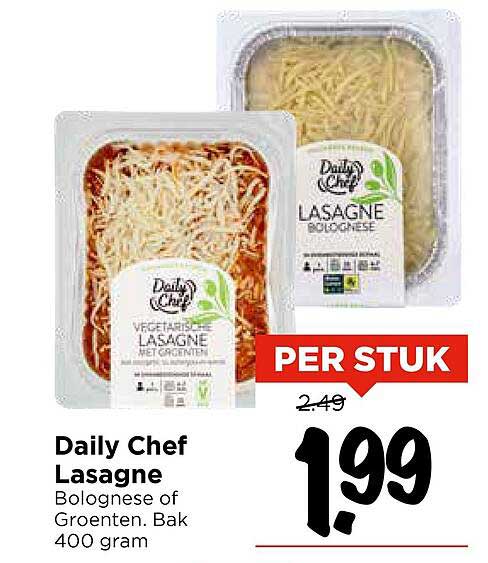 Ontdek de geweldige Daily Chef Lasagne aanbieding in de nieuwste Vomar folder. Naast deze aanbieding vind je nog veel meer aantrekkelijke kortingen. Je kunt de Daily Chef Lasagne eenvoudig online bestellen via de Vomar website of kopen in een winkel bij jou in de buurt.