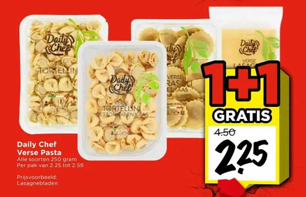 Normaal gesproken kost een verpakking Daily Chef Verse Pasta €4,50, maar met deze aanbieding van 1+1 gratis betaal je slechts €2,25 per pak. Dit betekent dat je voor de prijs van één twee keer zoveel kunt genieten van deze heerlijke pasta. Een slimme keuze voor je portemonnee en je smaakpapillen!