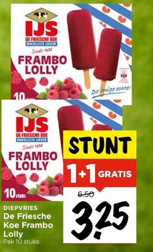 Bekijk nu de De Friesche Koe Frambo Lolly aanbieding in de Vomar folder. Deze aanbieding is geldig van 18-06-2025 tot en met 21-06-2025.