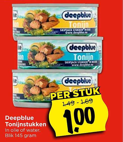 Bekijk de Deepblue Tonijnstukken aanbieding bij Vomar! Deze fantastische aanbieding is nu beschikbaar in de nieuwste Vomar folder. Profiteer van deze kans en bespaar flink op je aankoop.
