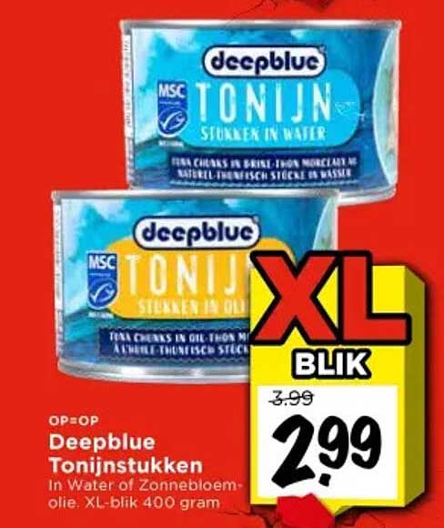 Bekijk nu de Deepblue Tonijnstukken in Water of Zonnebloemolie. XL-blik 400 gram aanbieding in de Vomar folder. Deze aanbieding is geldig van 09-10-2025 tot en met 11-10-2025.