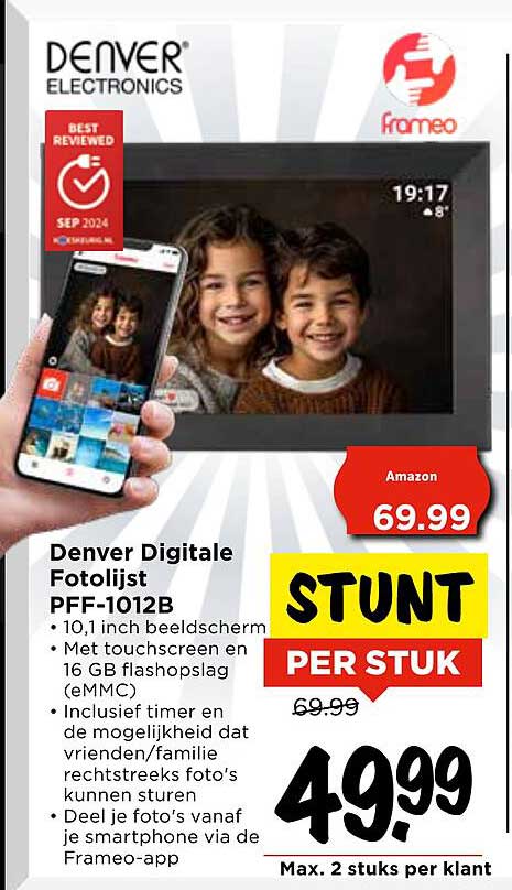 Bekijk de Denver Digitale Fotolijst Pff-1012B aanbieding bij Vomar! Deze fantastische aanbieding is nu beschikbaar in de nieuwste Vomar folder. Profiteer van deze kans en bespaar flink op je aankoop.
