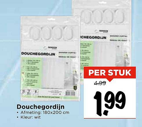 Normaal gesproken kost dit douchegordijn €4,99, maar nu is het verkrijgbaar voor slechts €1,99 per stuk! Dit betekent een aanzienlijke besparing, waardoor dit een geweldige kans is om jouw badkamer een upgrade te geven zonder de bank te breken. Maak gebruik van deze aanbieding en profiteer van de kortingen die Vomar biedt.