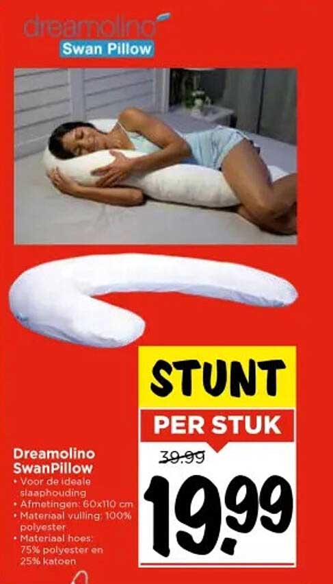 Bekijk de Dreamolino Swan Pillow aanbieding bij Vomar! Deze fantastische aanbieding is nu beschikbaar in de nieuwste Vomar folder. Profiteer van deze kans en bespaar flink op je aankoop.
