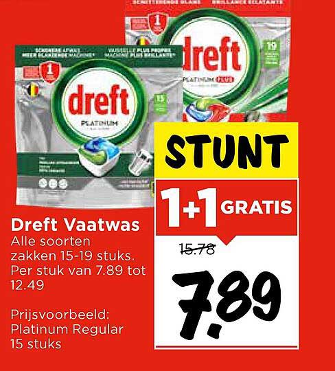 Als je op zoek bent naar de beste oplossing voor je vaat, dan is deze aanbieding van Dreft Vaatwas ideaal voor jou! Met hun krachtige formule zorgt Dreft ervoor dat je borden, bestek en glazen sprankelend schoon worden. Deze aanbieding is geldig voor alle soorten zakken van 15-19 stuks, waardoor je meer waar voor je geld krijgt. Mis deze kans niet om je vaatwasmiddel voorraad aan te vullen en tegelijk te besparen!