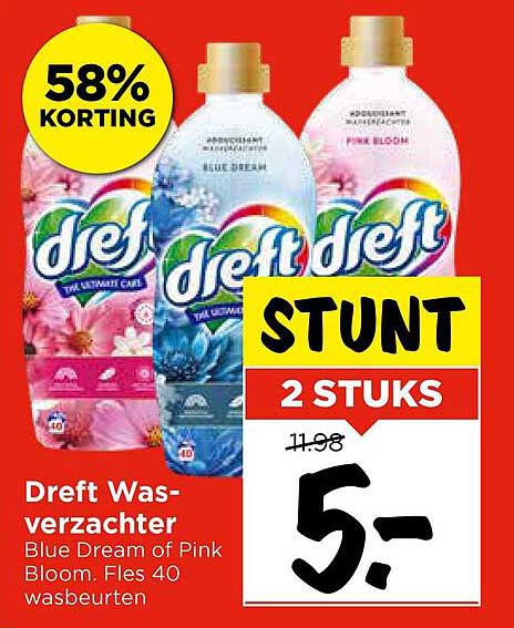 De reguliere prijs voor deze twee flessen Dreft Wasverzachter is €11,98, maar tijdens deze aanbieding betaal je slechts €5,-! Dat is een enorme besparing en een kans die je niet wilt missen. Je krijgt kwalitatieve wasverzachters voor een prijs die je portemonnee zeker zal waarderen.