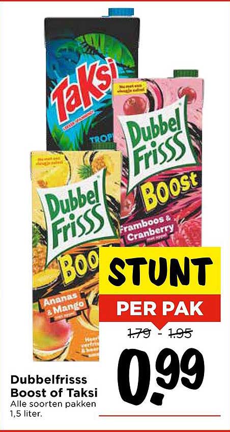 Geniet van een verfrissende dorstlesser met de aanbieding van Dubbelfrisss Boost of Taksi! Deze heerlijke vruchtensappen zijn perfect voor warme dagen, feestjes of gewoon om jezelf mee te trakteren. Van de tropische smaken van Taksi tot de fruitige combinaties van Dubbelfrisss, er is voor ieder wat wils. Met deze aanbieding haal je niet alleen smaak, maar ook een aantrekkelijk voordeel in huis!