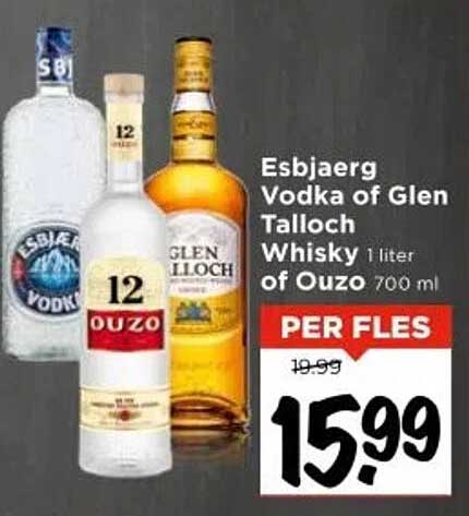 Heb je behoefte aan een lekkere drank voor een speciale gelegenheid of gewoon om thuis van te genieten? Op deze pagina vind je een geweldige aanbieding van Esbjaerg Vodka, Glen Talloch Whisky, of Ouzo. Voor een beperkte tijd, van 23 oktober tot en met 25 oktober 2025, kun je deze kwaliteitsdranken kopen voor een aantrekkelijke prijs!