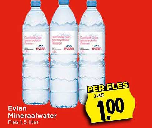 Bekijk nu de Evian Mineraalwater Fles 1,5 liter aanbieding in de Vomar folder. Deze aanbieding is geldig van 16-10-2025 tot en met 18-10-2025.