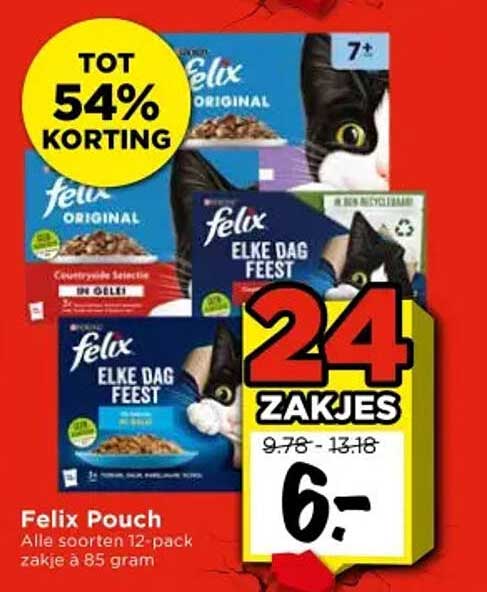 Heb je een poes die altijd op zoek is naar heerlijk en gevarieerd eten? Dan is deze aanbieding iets voor jou! De Felix Pouch, beschikbaar in een 12-pack van 85 gram zakjes, biedt een scala aan smaken die zelfs de meest kieskeurige katten zullen verrassen. Met een korting tot maar liefst 54% is dit het perfecte moment om voordelig in te slaan!