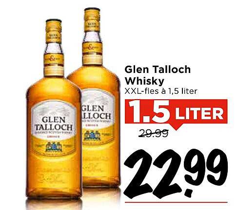 Ben jij een liefhebber van whisky? Dan is deze aanbieding bij Vomar iets voor jou! De Glen Talloch Whisky is nu beschikbaar in een XXL-fles van maar liefst 1,5 liter. Met een korting van maar liefst €7,00 op de normale prijs, is dit de perfecte kans om je favoriete drank voor een geweldige prijs in huis te halen.