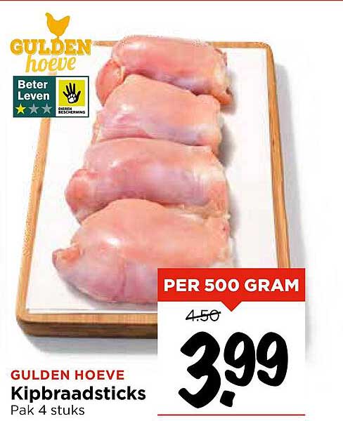 De kipbraadsticks worden geleverd in een verpakking van 4 stuks en zijn zorgvuldig geselecteerd voor de beste kwaliteit. Ze zijn per 500 gram geprijsd, met een normale prijs van €4,50, nu tijdelijk voor slechts €3,99. Dit betekent dat je niet alleen geniet van een lekker product, maar ook flink bespaart!