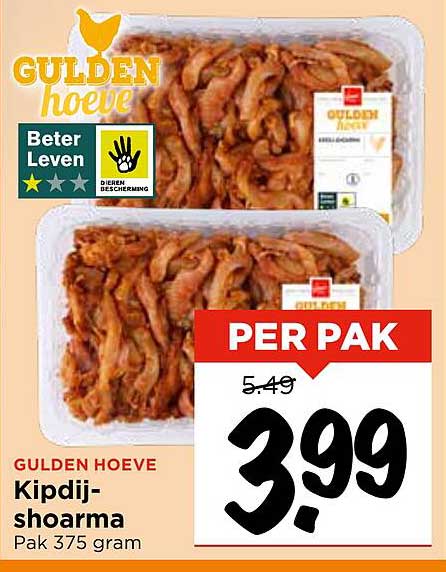 Bekijk nu de Gulden Hoeve Kipdij-shoarma Pak 375 gram aanbieding in de Vomar folder. Deze aanbieding is geldig van 20-04-2025 tot en met 26-04-2025.