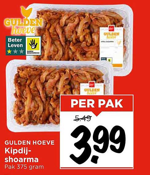 Als je op zoek bent naar een heerlijke en veelzijdige maaltijd, dan is deze aanbieding van de GULDEN HOEVE Kipdij-shoarma precies wat je nodig hebt! Van 23 juli tot en met 26 juli 2025 kun je deze smakelijke shoarma voor een aantrekkelijke prijs van slechts €3,99 per pak aanschaffen. Dit is het moment om je koelkast te vullen met deze heerlijke kipdij-shoarma!
