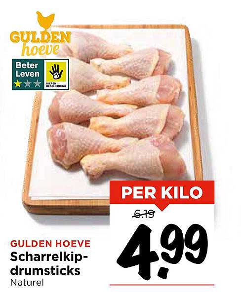 Normaal gesproken betaal je €6,19 per kilo voor deze scharrelkip-drumsticks. Met de geweldige actieprijs van €4,99 per kilo bespaar je maar liefst €1,20! Dit is een kans die je niet wilt missen, vooral als je van goede kwaliteit en smaak houdt.