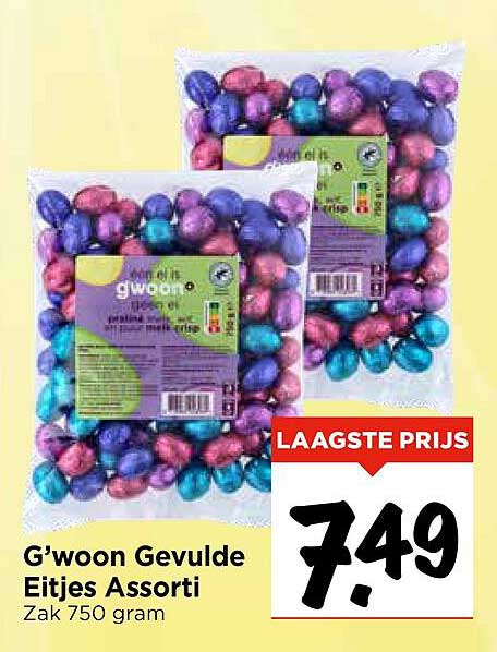 Op zoek naar een heerlijk tussendoortje of een leuke traktatie voor tijdens de feestdagen? Dan is de aanbieding van G’woon Gevulde Eitjes Assorti iets voor jou! Deze kleurrijke eitjes zijn niet alleen aantrekkelijk om te zien, maar ook om te proeven. Perfect voor in een paascadeau of als zoete snack op een feestje. Deze aanbieding is geldig van 19 maart tot en met 22 maart 2025, dus mis het niet!