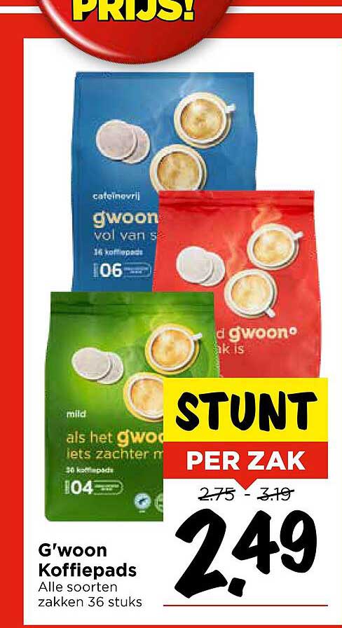 De reguliere prijs van G'woon koffiepads ligt tussen de € 2,75 en € 3,19 per zak. Met deze aanbieding betaal je slechts € 2,49 per zak. Dit is een geweldige gelegenheid om je voorraad aan te vullen of om verschillende smaken uit te proberen. Waarom meer betalen als je kunt genieten van dezelfde kwaliteit voor minder geld?