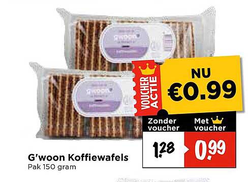 Bekijk nu de G'woon Koffiewafels Pak 150 gram aanbieding in de Vomar folder. Deze aanbieding is geldig van 04-06-2025 tot en met 07-06-2025.