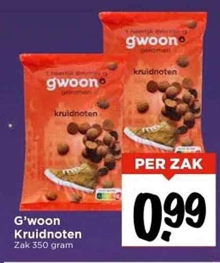 Op zoek naar een smakelijke en gezellige traktatie? Dan zijn de G'woon Kruidnoten echt iets voor jou! Deze heerlijke kruidnoten zijn perfect voor de feestdagen of gewoon als tussendoortje. Met hun unieke kruidenmix en knapperige bite zijn ze een ware smaakervaring die je niet wilt missen. Bovendien is de prijs van slechts €0,99 per zak een geweldige deal!