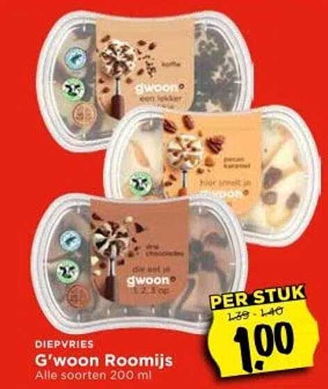 Ben jij ook zo dol op een lekker romig ijsje? Dan hebben we goed nieuws voor je! Op deze pagina ontdek je een onweerstaanbare aanbieding voor G'woon Roomijs. Dit heerlijke roomijs is beschikbaar in verschillende smaken en is perfect voor een warmere dag of als verfrissing na een lange dag. Met deze aanbieding kun je jezelf en je geliefden verwennen zonder je zorgen te maken over de prijs.