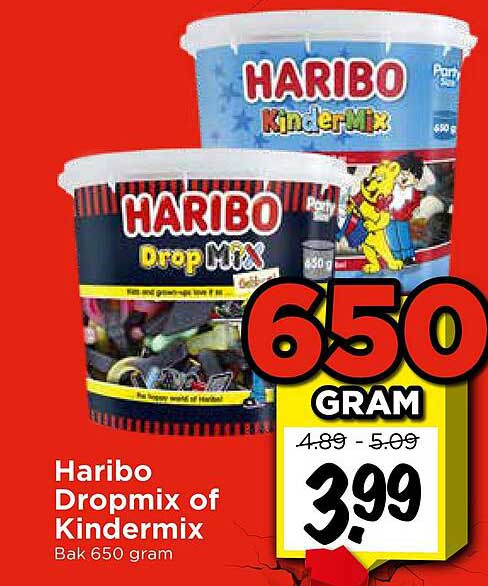 Bekijk nu de Haribo Dropmix of Kindermix Bak 650 gram aanbieding in de Vomar folder. Deze aanbieding is geldig van 30-04-2025 tot en met 03-05-2025.
