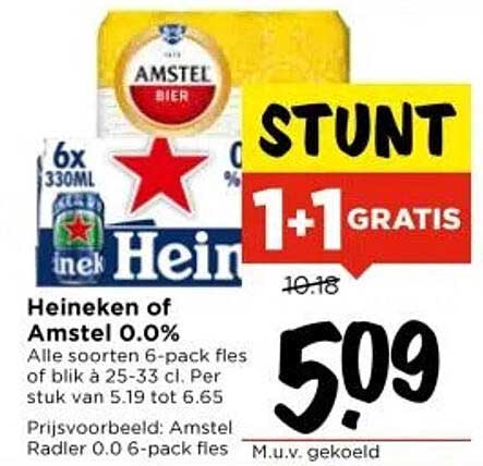 Bekijk nu de Heineken of Amstel 0.0% aanbieding in de Vomar folder. Deze aanbieding is geldig van 11-09-2025 tot en met 13-09-2025.
