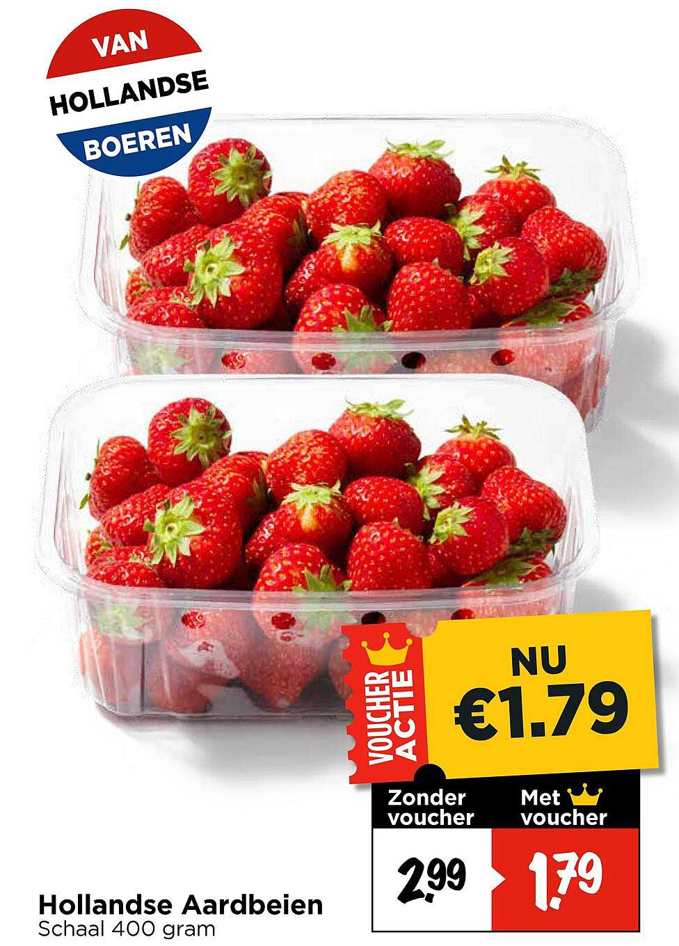 De reguliere prijs voor een schaal Hollandse aardbeien bedraagt €2,99, maar dankzij deze aanbieding kun je ze nu verkrijgen voor slechts €1,79! Dat is een flinke besparing! Met een voucher profiteer je nog meer en haal je deze heerlijke aardbeien in huis voor de laagste prijs ooit.
