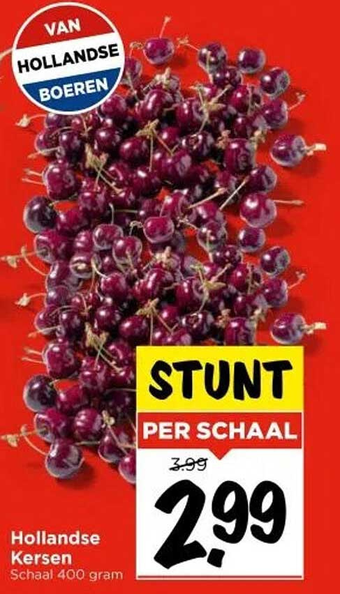 Normaal gesproken betaal je €3,99 voor deze schaal kersen, maar met deze aanbieding kun je ze nu krijgen voor slechts €2,99. Dat is een flinke besparing! Een kans om je favoriete fruit voordelig in huis te halen.