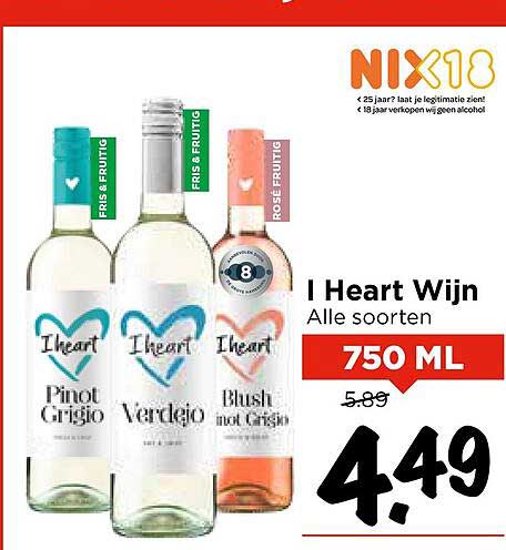 Bekijk nu de I Heart Wijn - Alle soorten 750 ML aanbieding in de Vomar folder. Deze aanbieding is geldig van 30-07-2025 tot en met 02-08-2025.