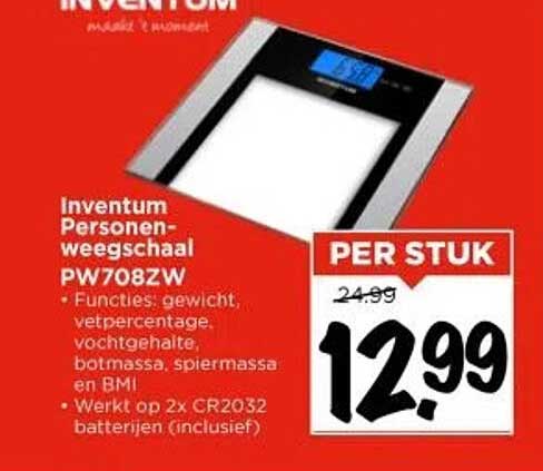 Bekijk nu de Inventum Personen-weegschaal PW708ZW aanbieding in de Vomar folder. Deze aanbieding is geldig van 01-01-2025 tot en met 04-01-2025.