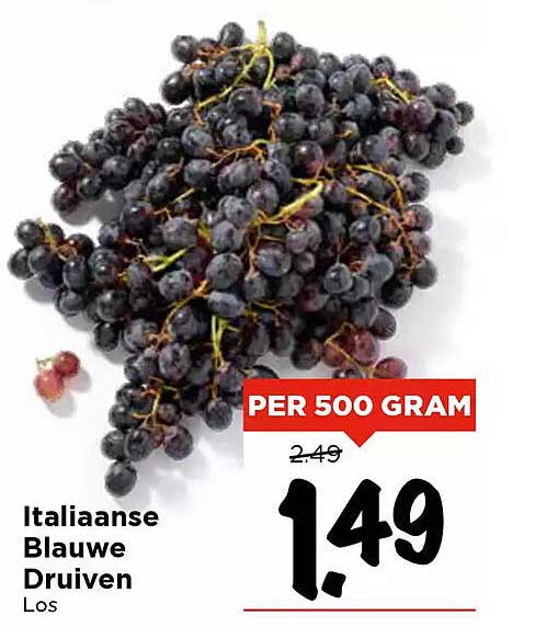 Bekijk de Italiaanse Blauwe Druiven aanbieding bij Vomar! Deze fantastische aanbieding is nu beschikbaar in de nieuwste Vomar folder. Profiteer van deze kans en bespaar flink op je aankoop.