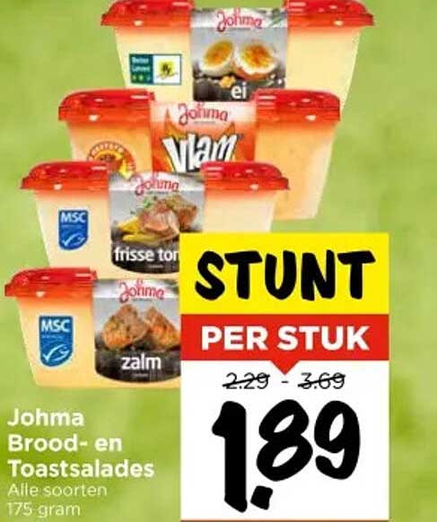 Origineel zijn deze Johma salades te koop van €2,29 tot €3,69 per stuk. Maar tijdens deze actie zijn ze nu verkrijgbaar voor slechts €1,89 per stuk! Dat betekent dat je flinke besparingen kunt realiseren, perfect om uit te proberen of om je favoriete smaken in te slaan. Dit is de uitgelezen kans om deze heerlijke producten tegen een lage prijs in huis te halen.
