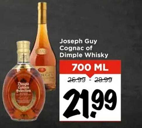 Bekijk nu de Joseph Guy Cognac of Dimple Whisky 700 ML aanbieding in de Vomar folder. Deze aanbieding is geldig van 04-09-2025 tot en met 06-09-2025.