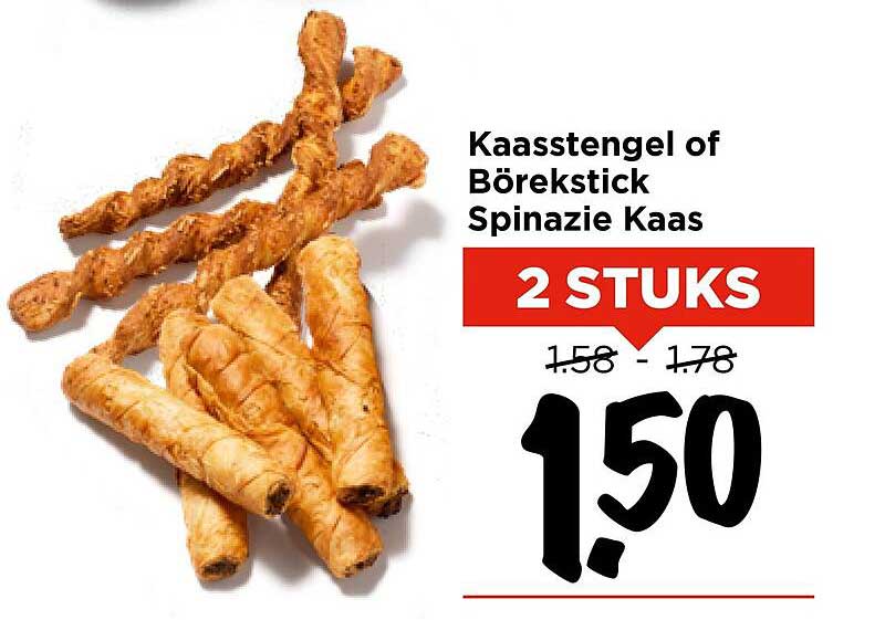 Bekijk nu de Kaasstengel of Börekstick Spinazie Kaas aanbieding in de Vomar folder. Deze aanbieding is geldig van 12-09-2024 tot en met 14-09-2024.