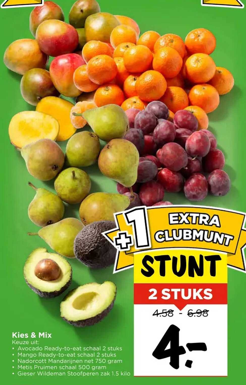 Met de "Kies & Mix" aanbieding kun je jouw favoriete fruit combineren in één heerlijke mix. Of je nu een avocado voor een avocado toast wilt, mandarijnen voor een frisse snack of stoofperen wilt voor een warm toetje, de mogelijkheden zijn eindeloos! Deze veelzijdige aanbieding is perfect voor zowel het ontbijt, de lunch als als een gezonde snack tussendoor.