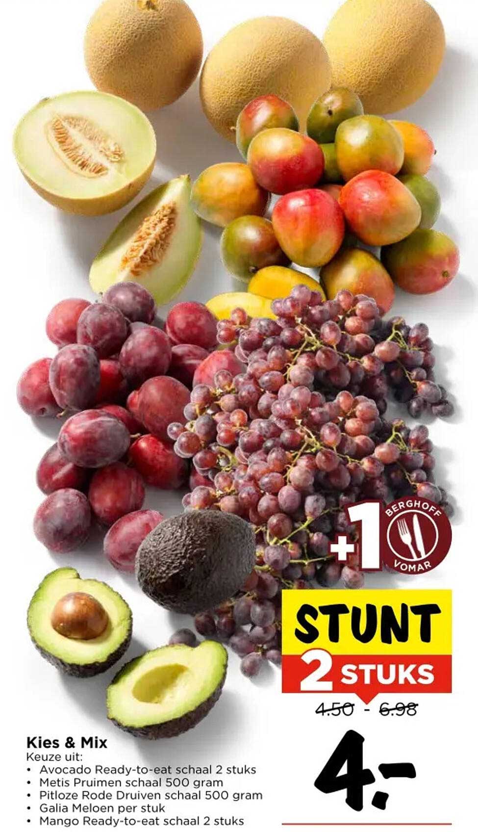 Met de Kies & Mix aanbieding kun je zelf je favoriete fruitsoorten samenstellen. Of het nu gaat om de romige avocado, de sappige mango of de zoete pruimen, er is voor ieder wat wils. Het is niet alleen lekker, maar ook gezond voor zowel jong als oud. Een goede reden om deze aanbieding niet te missen!