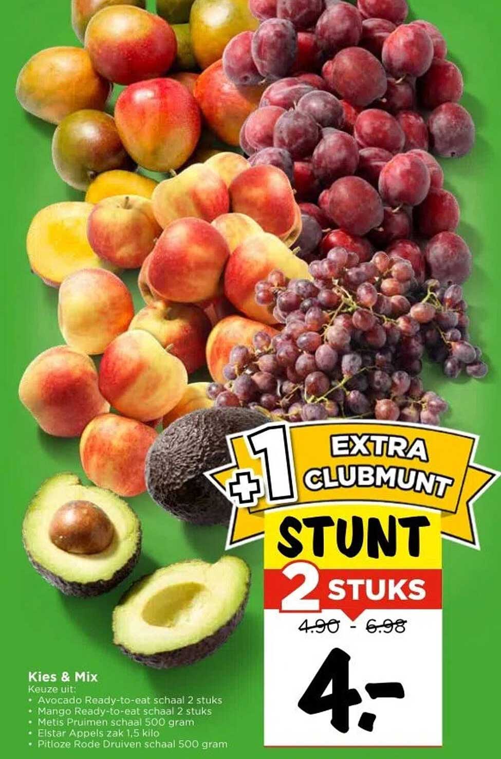 Bij de Kies & Mix aanbieding kun je niet alleen genieten van de heerlijke smaken van avocado, mango, pruimen, Elstar appels en rode druiven, maar je profiteert ook van het gemak van keuze. Of je nu een smoothie wilt maken, een fruitige salade wilt bereiden of gewoon wilt knabbelen, je hebt de juiste ingrediënten binnen handbereik. Het assortiment is perfect voor zowel tussendoortjes als voor bij een maaltijd.