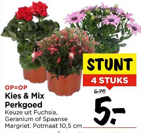 Ben je op zoek naar een manier om je tuin of balkon te verfraaien? Dan is deze aanbieding van Vomar de oplossing! Met de 'Kies & Mix Perkgoed' aanbieding krijg je vier prachtige plantjes in één pakket. Dit is dé kans om je buitenruimte op te fleuren met prachtige kleuren en geuren.