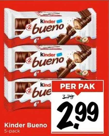 Bekijk de Kinder Bueno 5-Pack aanbieding bij Vomar! Deze fantastische aanbieding is nu beschikbaar in de nieuwste Vomar folder. Profiteer van deze kans en bespaar flink op je aankoop.