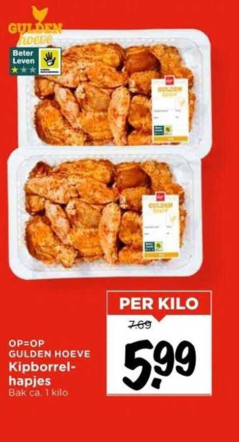 Normaal gesproken kost een kilo Kipborrel-hapjes €7,69, maar nu kun je ze scoren voor slechts €5,99! Dit betekent een besparing van maar liefst €1,70 per kilo. Grijp deze kans om je voorraad aan te vullen, want op = op!
