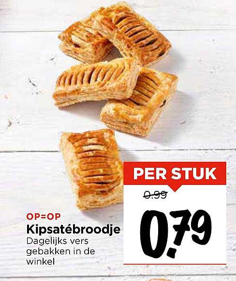 Heb je zin in een heerlijke snack? Het kipsatébroodje, dagelijks vers gebakken in de winkel, is nu tijdelijk verkrijgbaar voor slechts €0,79 per stuk! Dit is een geweldige kans om jezelf te trakteren op een smakelijke, hartige lekkernij. Perfect voor een snelle lunch of als tussendoortje wanneer je onderweg bent.