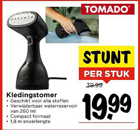 Heb je moeite met kreukels in je kleding? Dan is de Kledingstomer de perfecte oplossing voor jou! Deze handige stomer maakt het mogelijk om jouw favoriete outfits snel en eenvoudig op te frissen. Met de aanbieding van Vomar profiteer je van een geweldige korting, zodat je kleding er altijd op zijn best uitziet. Waarom zou je wachten? Met een prijs van slechts 19,99 euro, kan je ook vandaag nog genieten van deze fantastische aanbieding!
