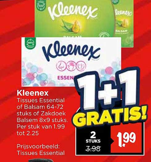 Heb je behoefte aan de beste zorg voor je neus? Zoek niet verder! Kleenex biedt nu een geweldige aanbieding die je niet wilt missen. Met de kleenex tissues in de aanbieding, krijg je niet alleen een premium product, maar ook waar voor je geld. Deze zachte en absorberende tissues zijn perfect voor dagelijks gebruik, of je nu thuis bent of onderweg. Met de unieke Balsam variant, biedt Kleenex een extra verzorgende ervaring voor je huid.