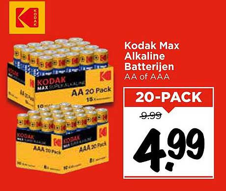 Ontdek de geweldige Kodak Max Alkaline Batterijen aanbieding in de nieuwste Vomar folder. Naast deze aanbieding vind je nog veel meer aantrekkelijke kortingen. Je kunt de Kodak Max Alkaline Batterijen eenvoudig online bestellen via de Vomar website of kopen in een winkel bij jou in de buurt.