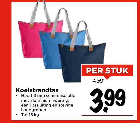 Normaal gesproken betaal je €7,99 voor deze tas, maar met de huidige aanbieding bespaar je flink! Voor slechts €3,99 heb je een robuuste en stijlvolle koelstrandtas in handen. Dit soort aanbiedingen krijg je niet elke dag, dus grijp je kans!
