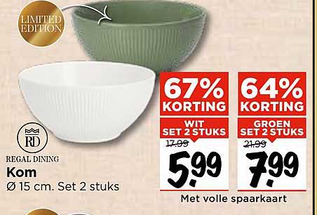 Bekijk de Kom Ø 15 Cm. Set 2 Stuks aanbieding bij Vomar! Deze fantastische aanbieding is nu beschikbaar in de nieuwste Vomar folder. Profiteer van deze kans en bespaar flink op je aankoop.