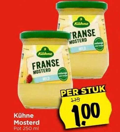 Bekijk de Kühne Franse Mosterd aanbieding bij Vomar! Deze fantastische aanbieding is nu beschikbaar in de nieuwste Vomar folder. Profiteer van deze kans en bespaar flink op je aankoop.